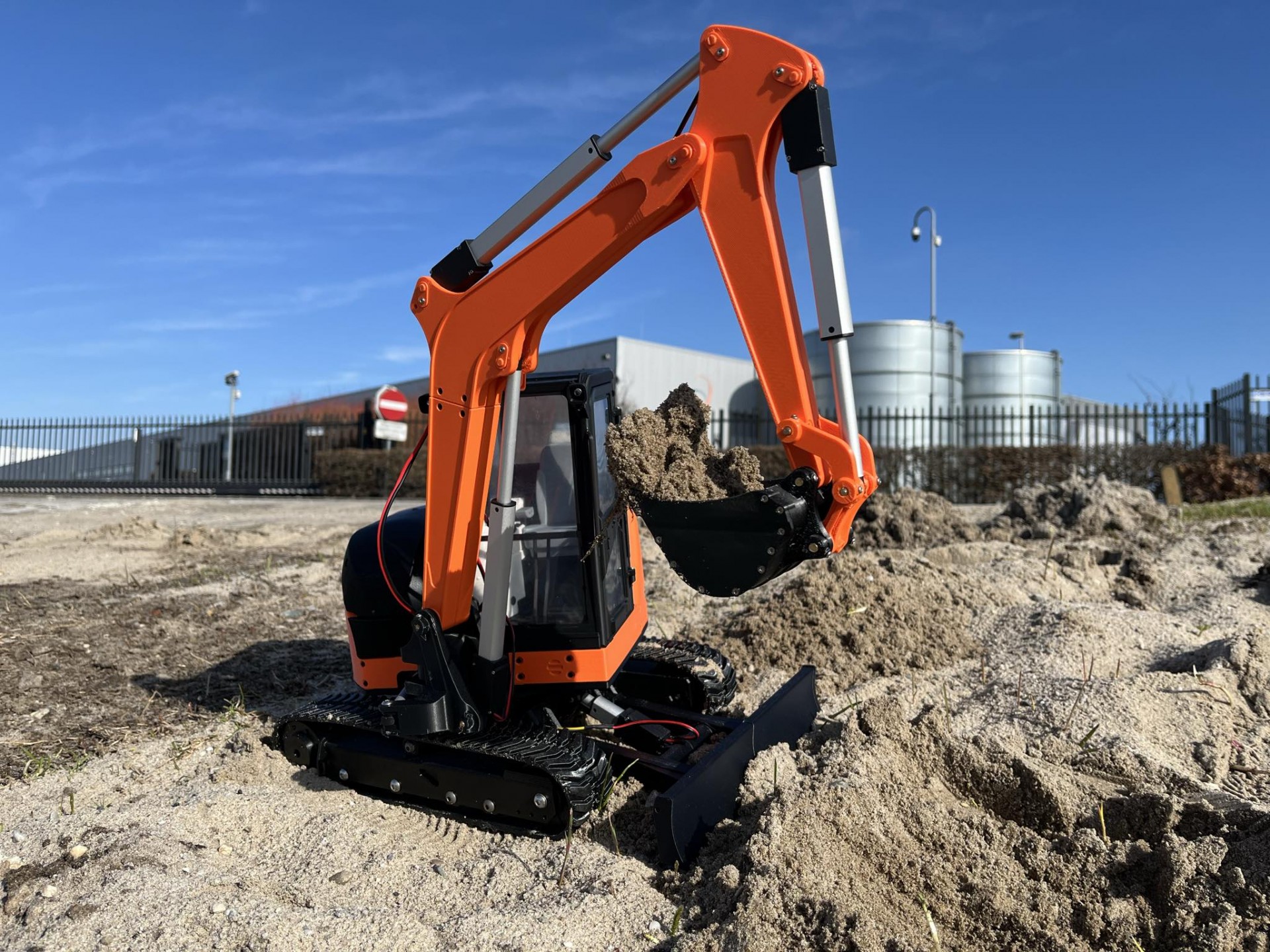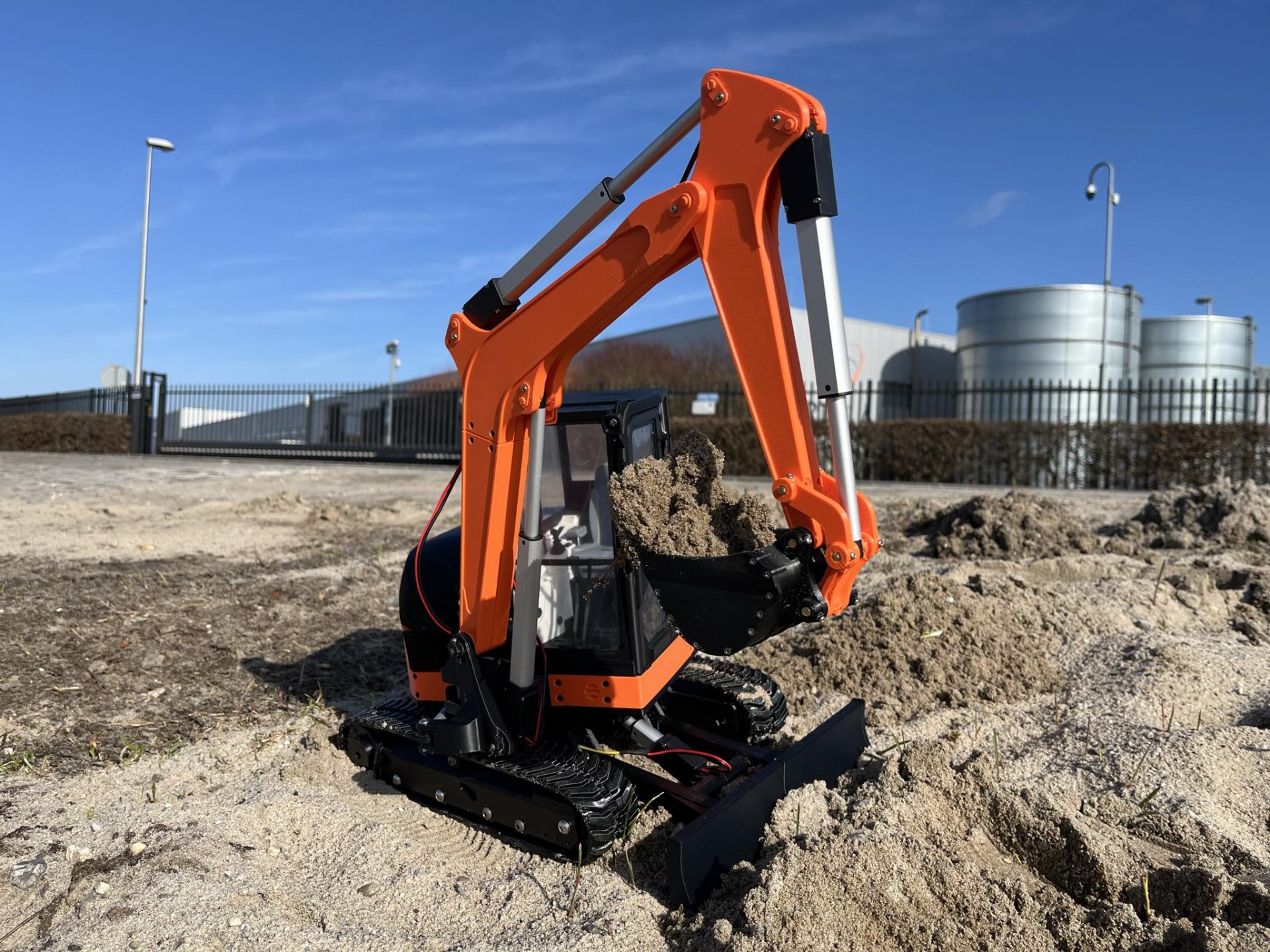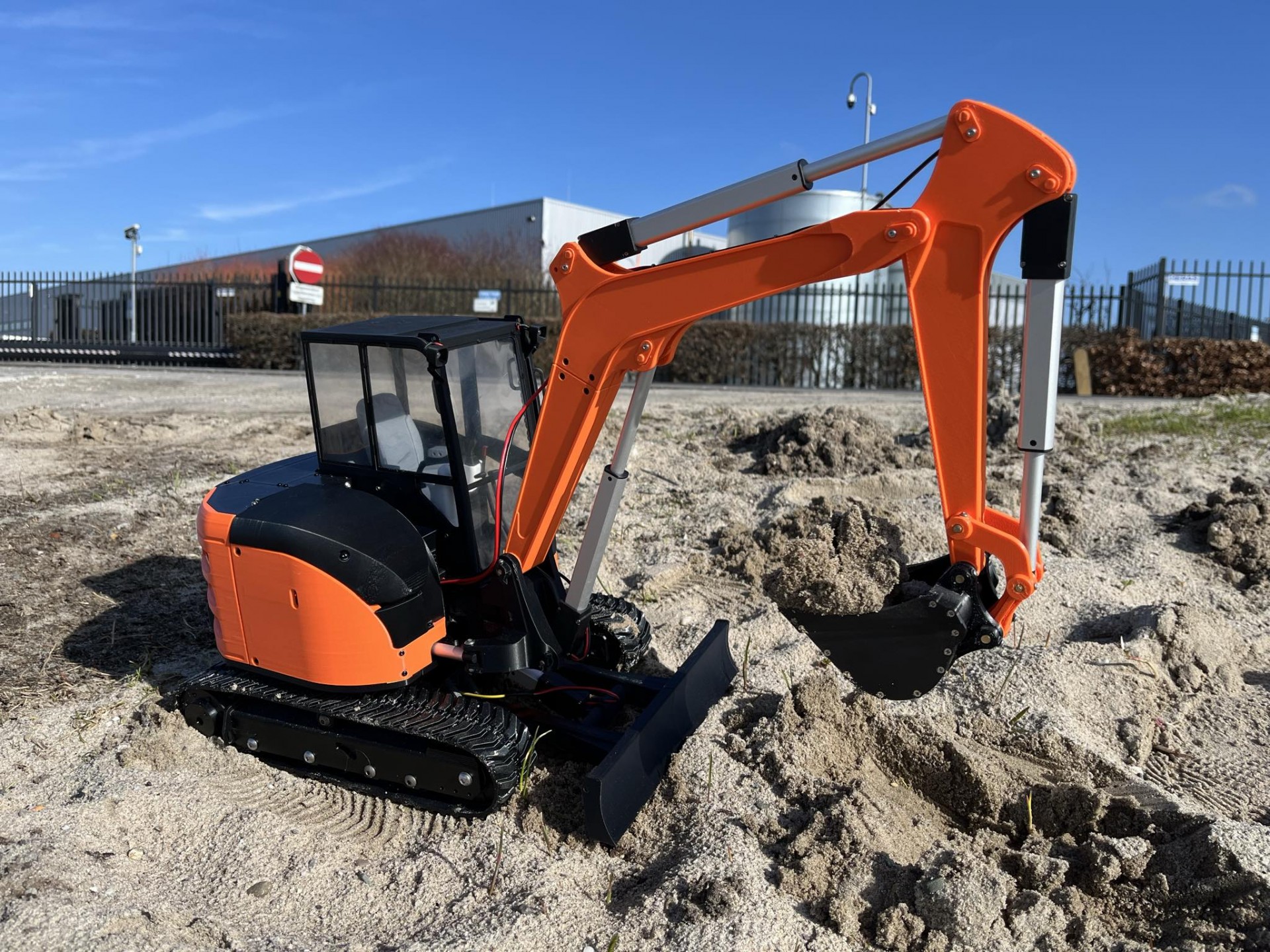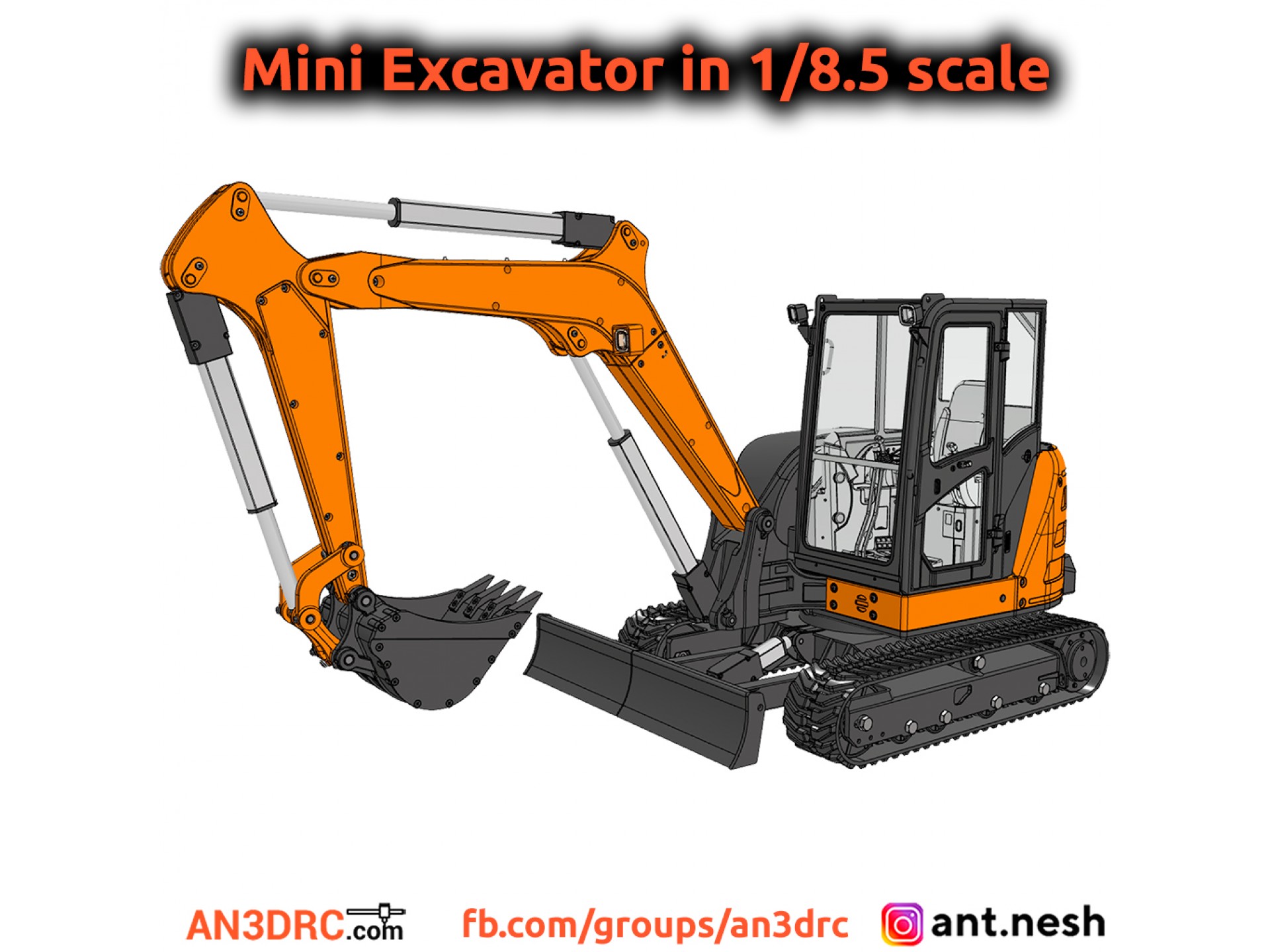 3D printed radio-controlled model of a Tracked Mini Excavator in 1/8.5 scale.